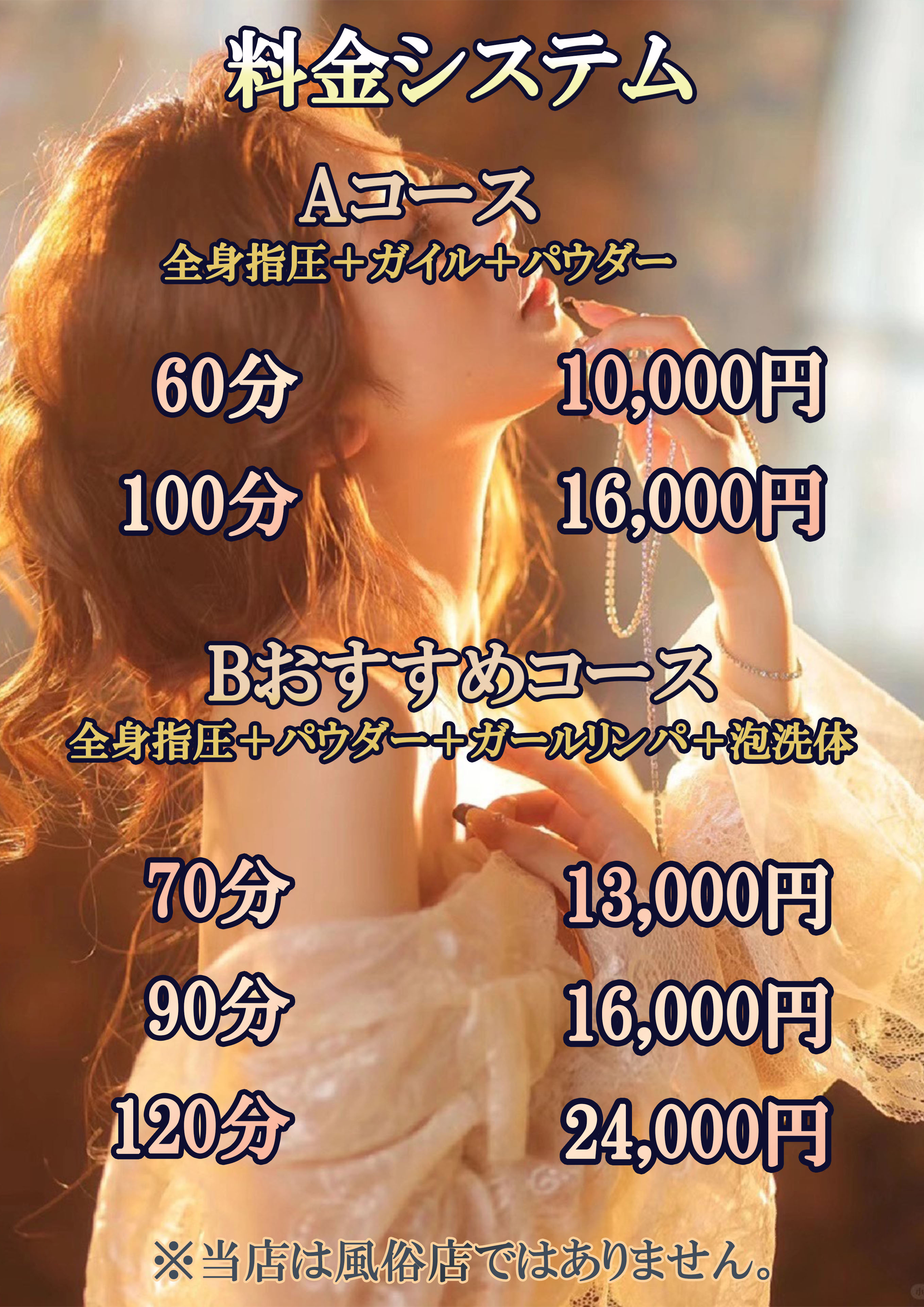 | 待遇 | 歩合制(保障給あり)、全額日払い可シフト自己申告制。その他、何かご要望がございましたらご相談に応じさせていただきます。 |